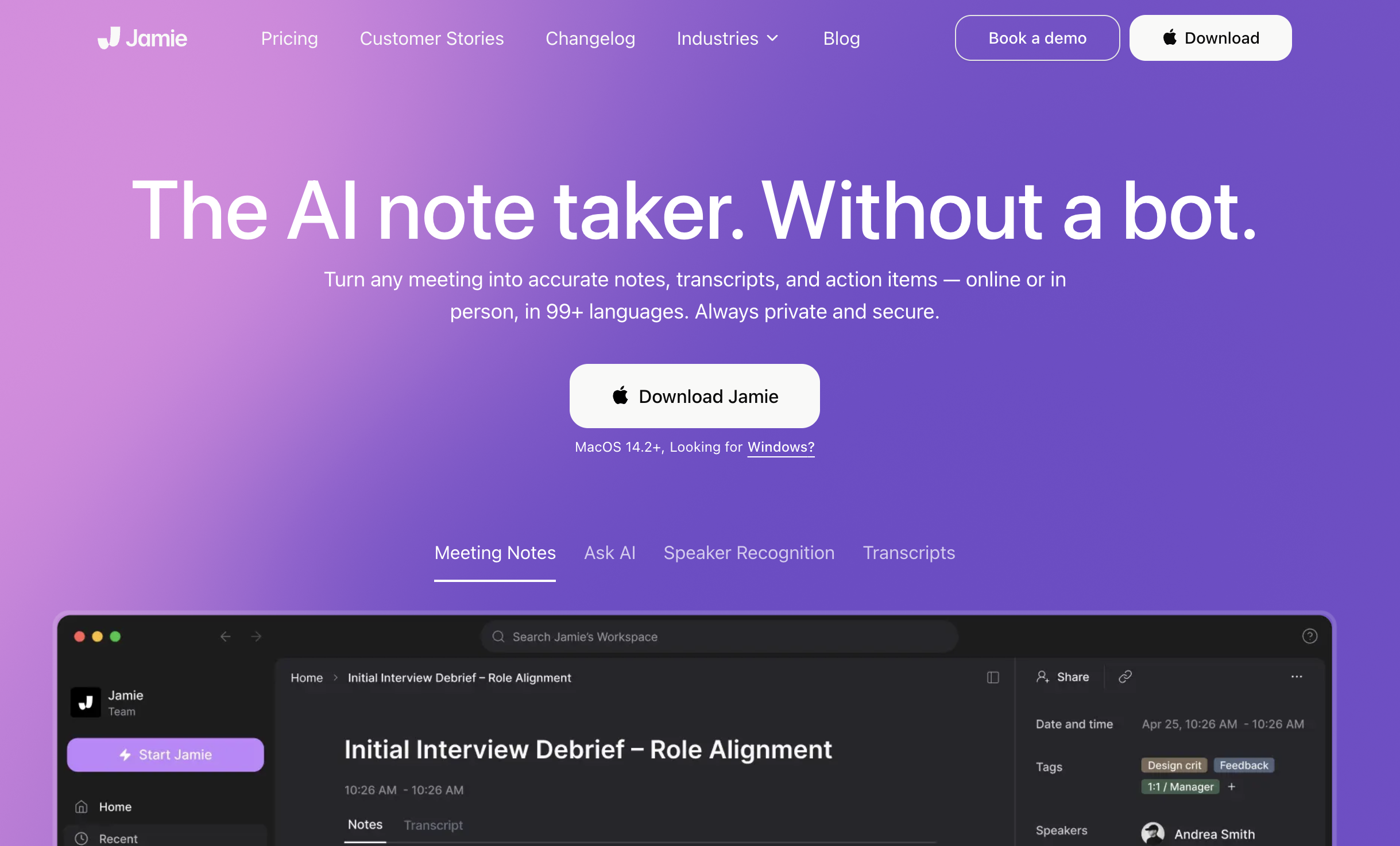 Jamie creates meeting notes and action items across any platform with a privacy-first approach particularly suited to European regulatory requirements.