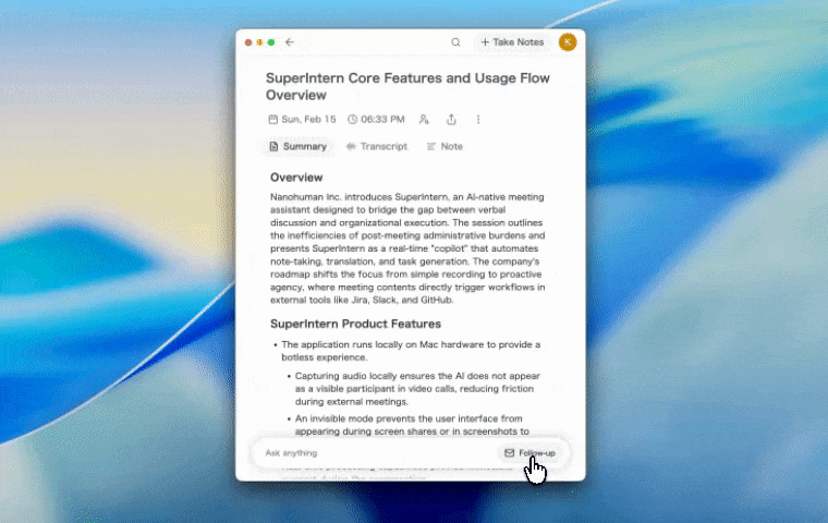 Draft a follow-up email from your meeting in seconds. After your meeting, simply click the Follow-up button in the AI chat — SuperIntern will generate a professional follow-up email based on your meeting summary, action items, and key decisions.