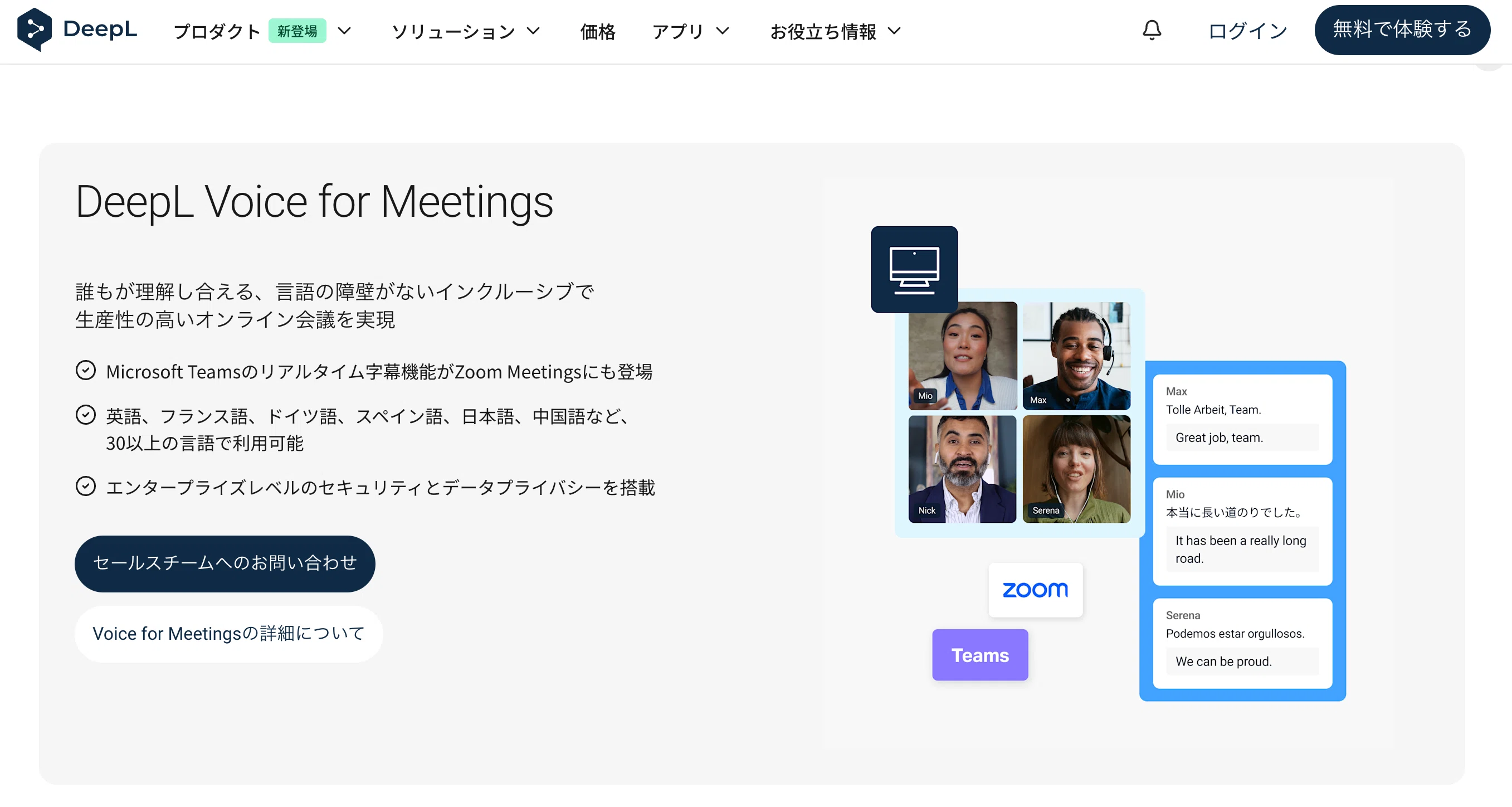 - DeepL Voice for Meetingsの場合、対応プラットフォームはZoomとTeamsのみ(Google Meetは非対応)