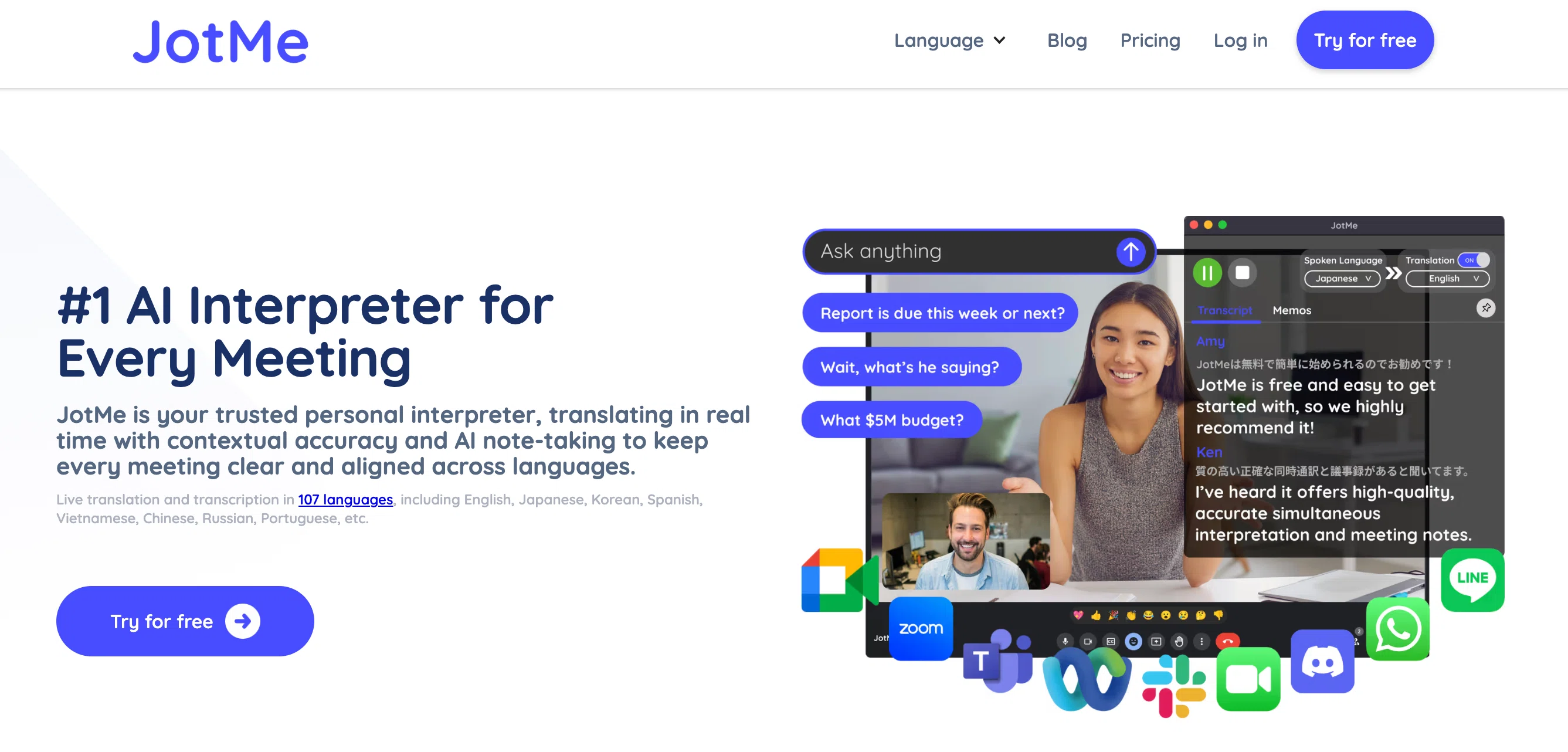 JotMeは、Chrome拡張またはデスクトップアプリで会議に接続する翻訳ツールです。107言語でリアルタイム翻訳を提供し、会議後にはAI整理ノートを生成します。