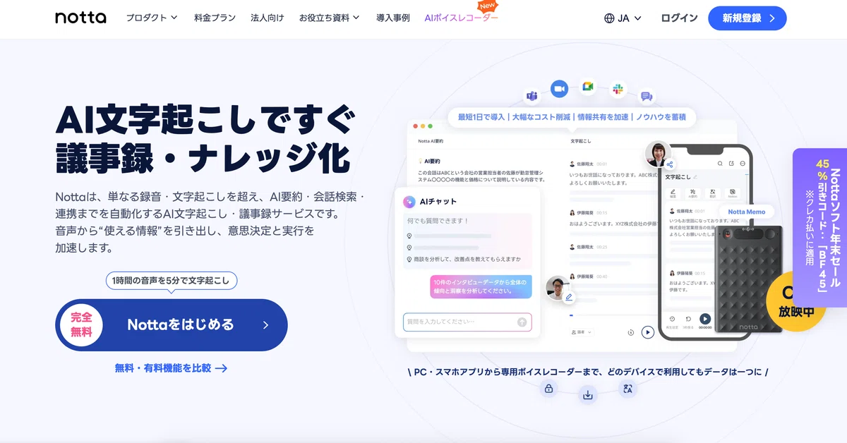 | Notta | 104言語 | あり | 複数対応 | 月額3,180円〜 | 導入実績多数 |